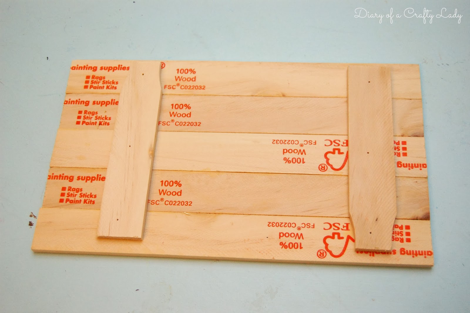Then, I used the a couple pieces just under 7" as the cross pieces, and glued those onto the back. While it was drying, to hold it all tightly together, I hammered in a few little nails just partway. I didn't have any nails short enough that they wouldn't poke through. Once it was dry I simply pulled the nails out. Wood glue is SO strong when it dries, there's no need to keep the nails!